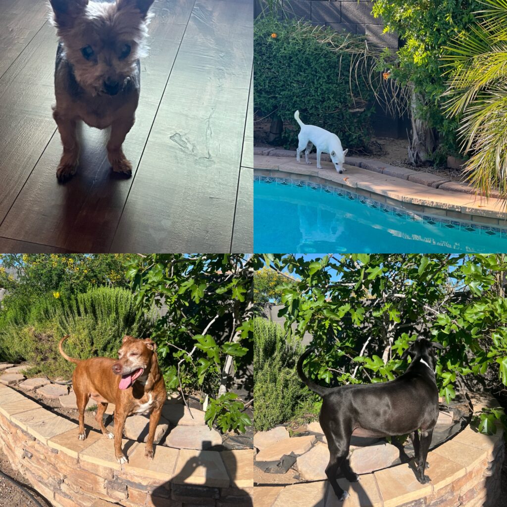 The Scarborough-Heilmeier pack is a unique one! Stella (the wee one) is the 15 year old matriarch who always gets her way; Outlaw (the red one) was our very first rescue foster who stole our hearts immediately; we rescued Paisley (the black one) as a puppy and she is the goofy, cuddly, land seal/velvet hippo of our dreams; and finally there is Nina (the white one), our forever foster who, after being returned to us four times, will live out her best life patrolling the pool.