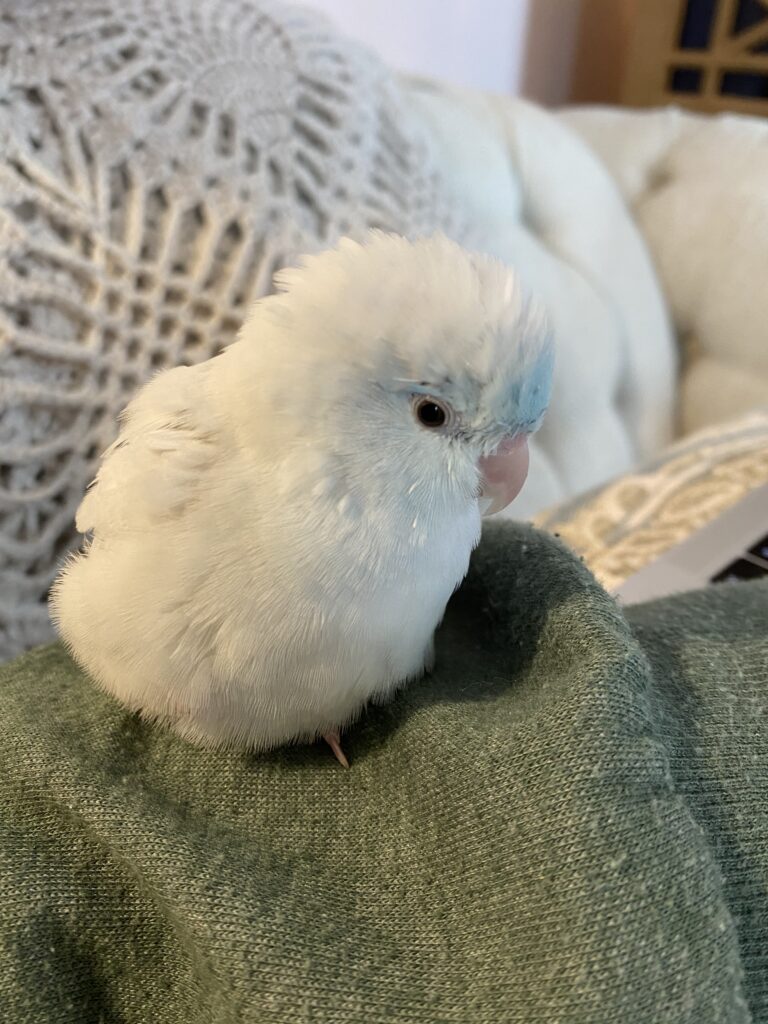 Meet Bonbon, a tiny parrot. She is 4 inches of fluff and is the branch manager of this location.
