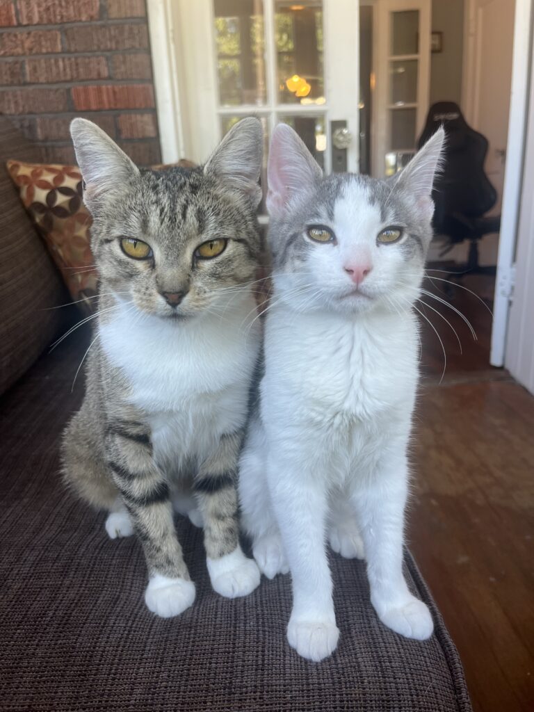 This is Mister and Misses! We rescued them both at our family’s house on the Mississippi River. After spending the majority of their life in the wild, they’re both now afraid of the outdoors.