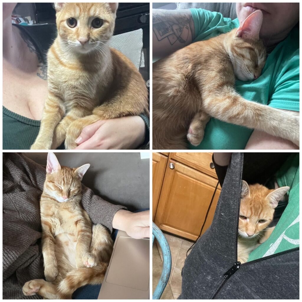We have 3 dogs, 7 cats and 3 chickens – because we rescue everything. However, this little girl named Gus thinks I am her personal cat bed, and I wouldn’t change it for the world.