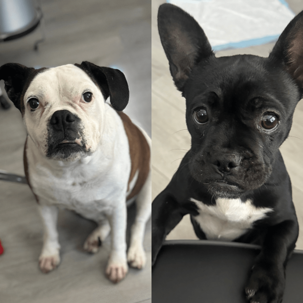 Meet Maggie Mae and Anela! Maggie is a loyal and loving 10 year old English Bulldog/Boxer mix. Anela is a 5 month old French Bullhuahua with tons of puppy energy!